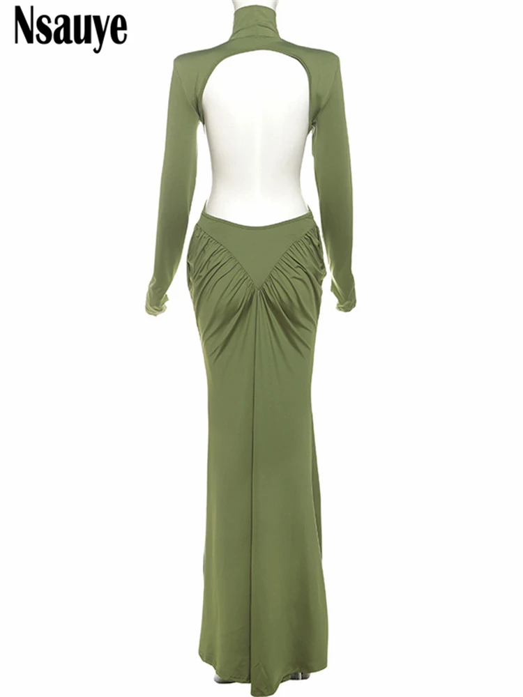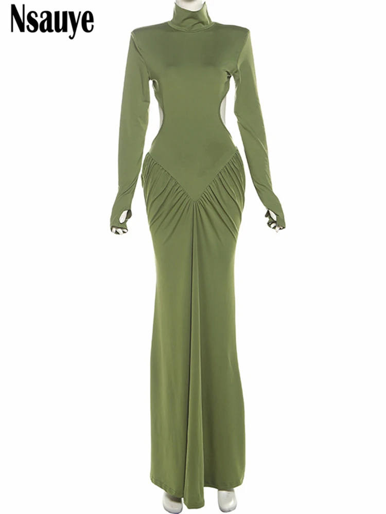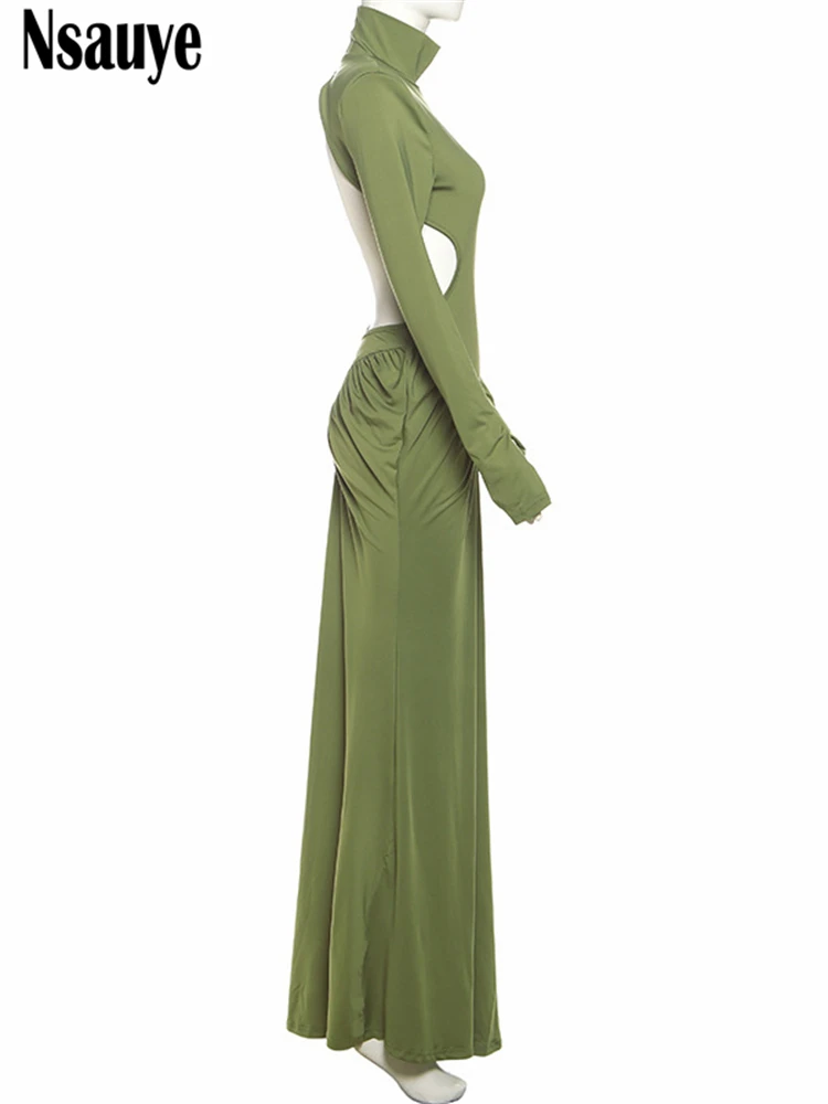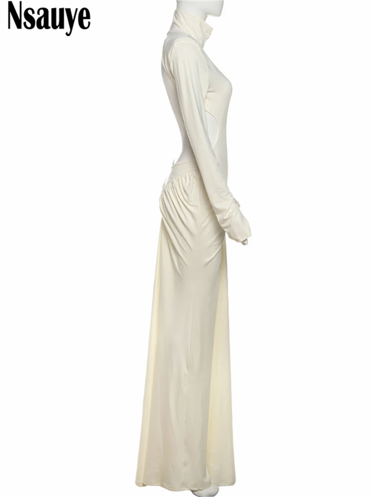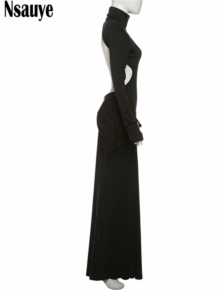 Fashion Elegant Long Sleeve Pullover Sexy Long Sleeve Club Evening Party Maxi Dress Women Turtleneck 2025 Cut Out Dress
