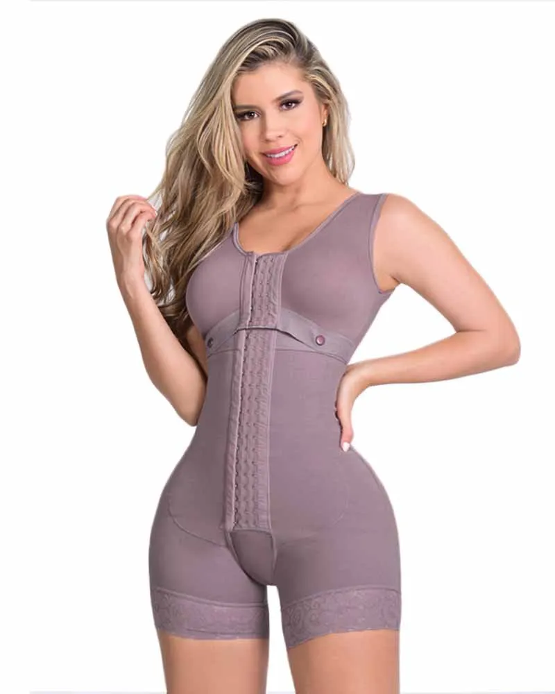 Postsurgical girdle with incorprated bra is designed to provide compression to the thighs and compresses the abdomen in all three levels.